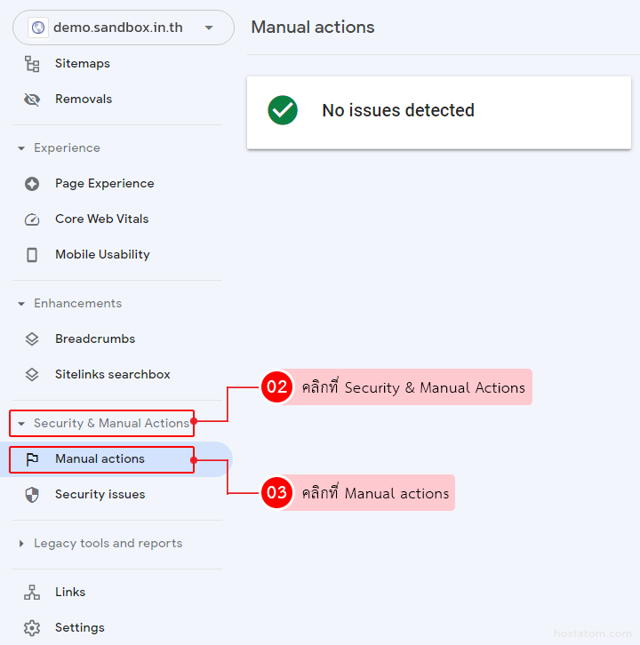 หรือหากใครใช้ Google Search Console สามารถมาเช็คได้ว่าโดเมนเราถูกแบนหรือไม่ได้ที่ Security & Manual Actions => Manaul actions