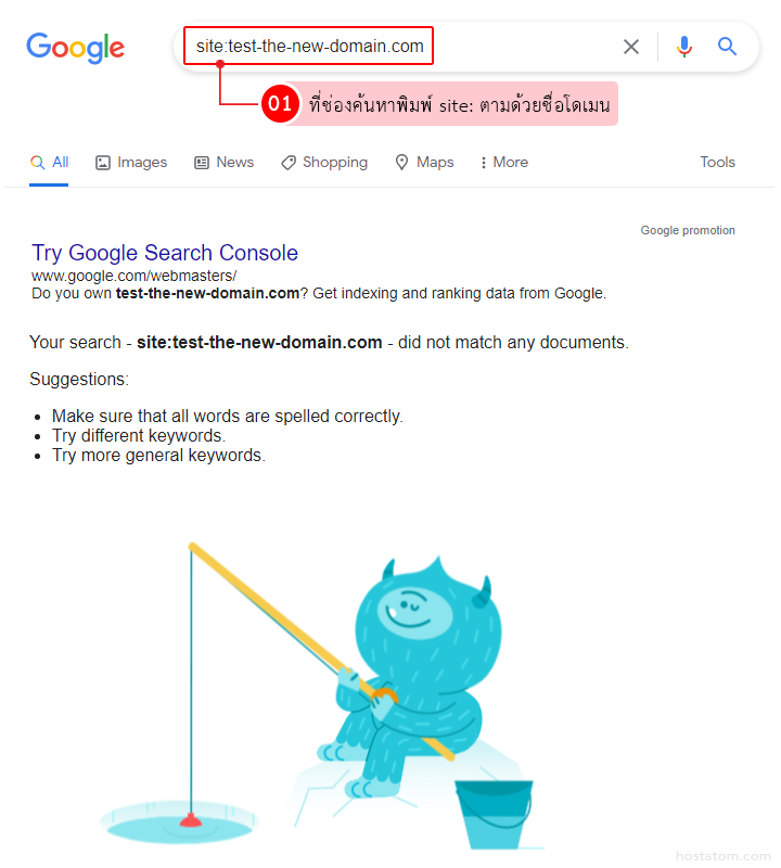 อันที่จริงคุณสามารถเช็คได้ว่า Spider เข้ามาเก็บข้อมูลเว็บของคุณไปหรือยัง โดยไปยังหน้าค้นหาของ Google แล้วพิมพ์ “site:ตามด้วยชื่อโดเมนของคุณ” ซึ่งหาก Google ยังไม่รู้จักเว็บของคุณผลลัพธ์ก็จะปรากฏ ดังภาพ ซึ่งไม่มีเนื้อหาใดๆ ของเว็บไซต์เราเลยที่ Google ได้ทำสารบัญเอาไว้แล้ว