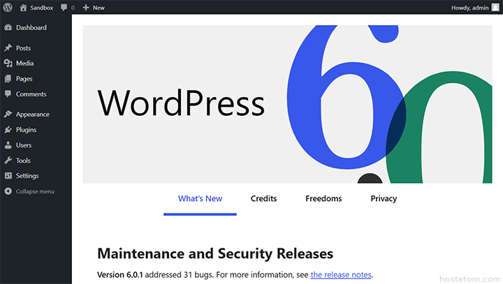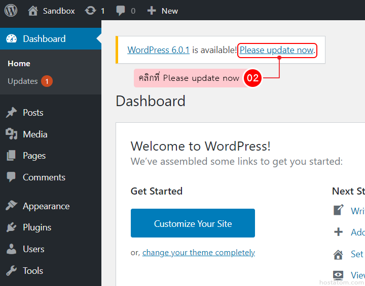 ระบบจะพามาที่หน้า dashboard พร้อมกับรายละเอียด WordPress ที่อัปเดตเป็นเวอร์ชันล่าสุด