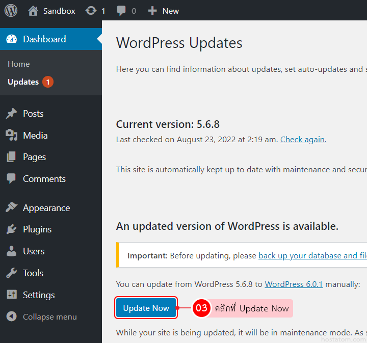ระบบจะพามาที่หน้าอัปเดต WordPress และแจ้งเวอร์ชันที่จะอัปเดต ให้คลิกที่ Update Now
