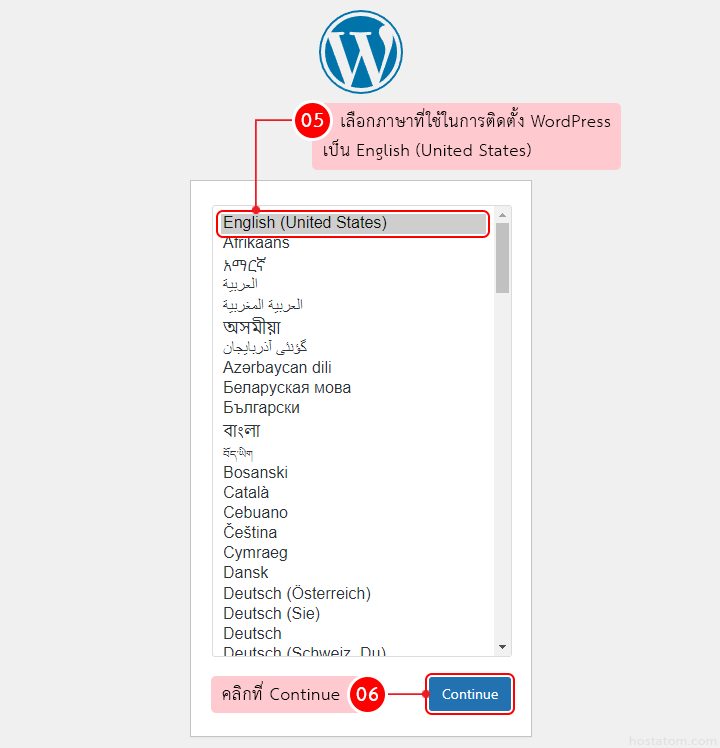 เลือกภาษาที่ใช้ในการติดตั้ง WordPress เป็น English (United States) จากนั้นคลิกที่ Continue