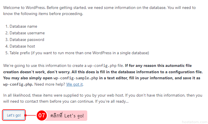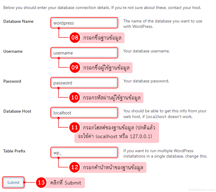 กรอกข้อมูลของฐานข้อมูลที่จะใช้เชื่อมต่อกับ WordPress