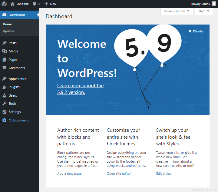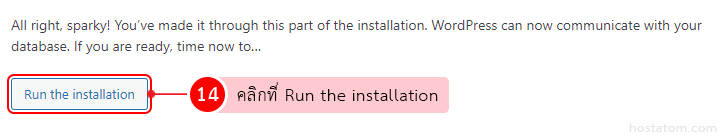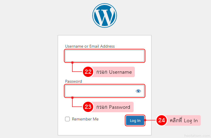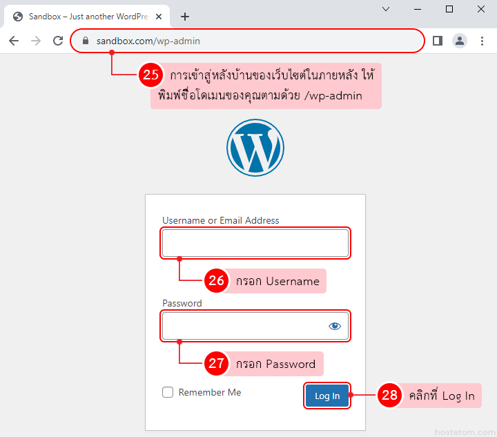 ในการเข้าสู่หลังบ้านของเว็บไซต์ในภายหลัง ให้พิมพ์ชื่ิอโดเมนของคุณตามด้วย /wp-admin (เช่น sandbox.com/wp-admin) กรอก Username, Password จากนั้นคลิกที่ Log In