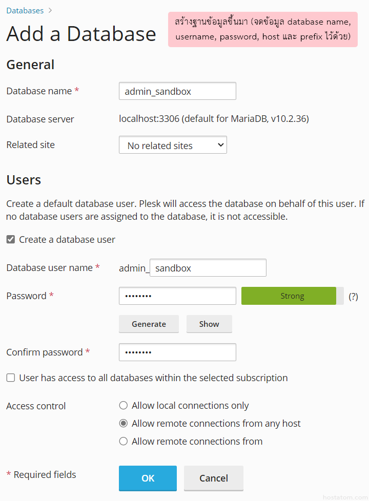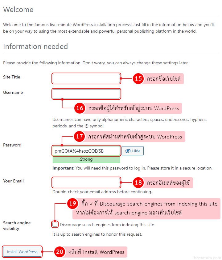 - Password : รหัสผ่านสำหรับเข้าสู่ระบบ WordPress (สามารถใช้รหัสผ่านที่ระบบสร้างให้หรือใช้รหัสผ่านที่กำหนดเองก็ได้)