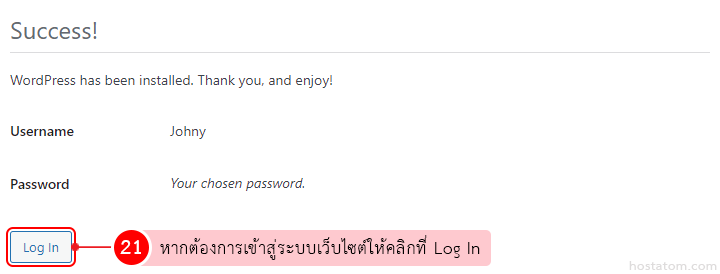 ระบบจะแจ้งว่าติดตั้ง WordPress เสร็จเรียบร้อยแล้ว หากต้องการเข้าสู่ระบบเว็บไซต์ให้คลิกที่ Log In