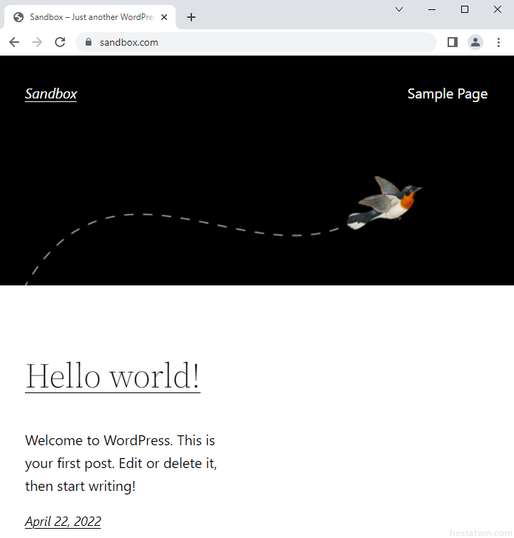 สำหรับหน้าตาของเว็บไซต์หลังจากติดตั้ง WordPress เสร็จแล้วจะเป็นดังภาพตัวอย่าง (เข้าด้วยการพิมพ์ชื่อโดเมนของคุณลงในเบราว์เซอร์)
