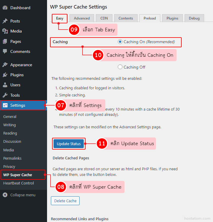 จากนั้นคลิกที่ Tab Easy ที่ Caching ให้ติ๊กเป็น Caching On จากนั้น คลิกที่ Update Status