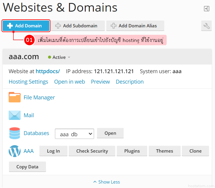 ก่อนอื่นให้เพิ่มโดเมนที่ต้องการเปลี่ยนเข้าไปยังบัญชี hosting ที่ใช้งานอยู่