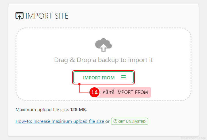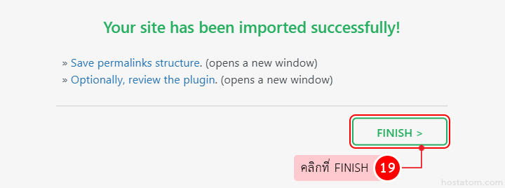 เมื่อ import เสร็จแล้ว จะขึ้นหน้าต่างแจ้งเตือนว่าเว็บไซต์ของคุณได้ import เสร็จเรียบร้อยแล้ว ให้คลิกที่ FINISH