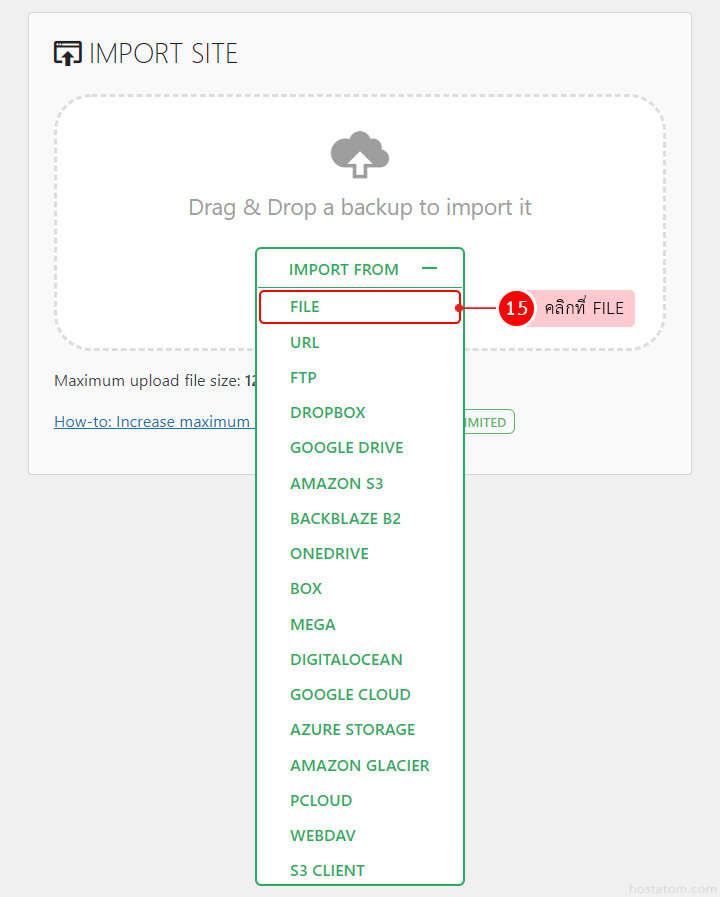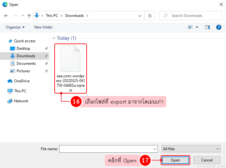 เลือกไฟล์ที่ export มาจากโดเมนเก่า (ตามค่ามาตรฐานจะอัปโหลดไฟล์ได้สูงสุดที่ขนาด 512 MB โดยสามารถกำหนด max upload size เพิ่มเติมได้เอง หรือหากใช้บริการกับทาง hostatom ก็สามารถแจ้งให้เจ้าหน้าที่ของเราช่วยเพิ่มได้เลย) จากนั้นคลิกที่ Open