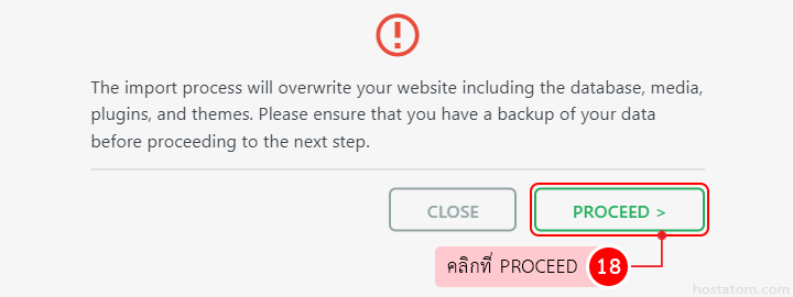 จะขึ้นหน้าต่างแจ้งเตือนว่าการ import จะทำการเขียนทับข้อมูลของเว็บไซต์ ให้คลิกที่ PROCEED