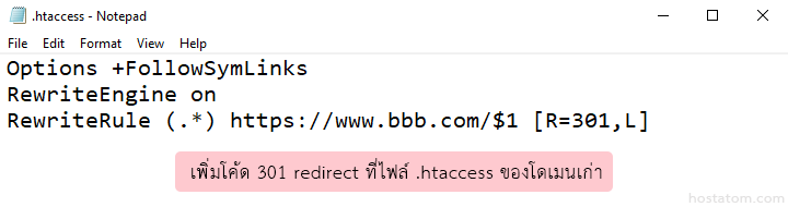 เมื่อโดเมนใหม่ (bbb.com) ใช้งานได้สมบูรณ์แล้ว ให้ทำ redirect ผู้ชมและ search engine บอทจากโดเมนเก่า (aaa.com) มายังโดเมนใหม่ (bbb.com) โดยการเพิ่มโค้ด 301 redirect ด้านล่างนี้ที่ไฟล์ .htaccess ของโดเมนเก่า (aaa.com)