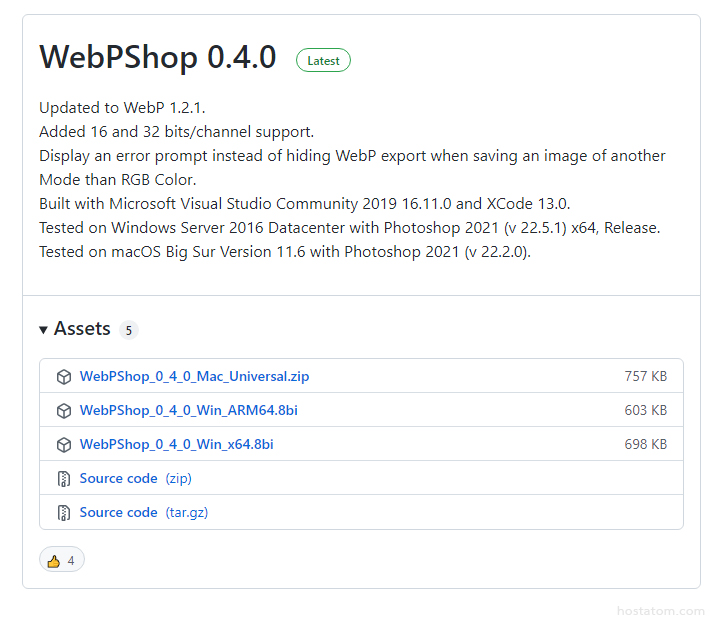 - ดาวน์โหลดไฟล์จาก GitHub โดยเลือกโหลดตามระบบที่คุณใช้งานอยู่ ไม่ว่าจะเป็น Mac หรือ Windows จากตัวอย่างนี้จะขอเลือก WebPShop_0_4_0Win_x64.8bi เพราะคอมพิวเตอร์ของผู้เขียนเป็น Windows 64 Bits