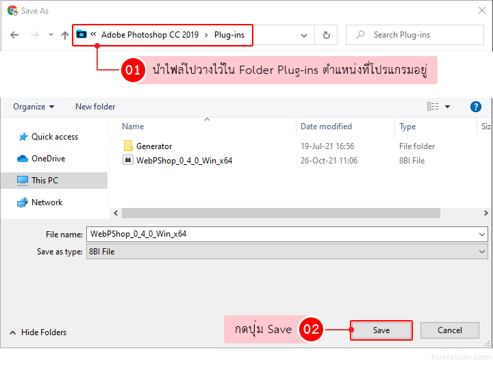 - บันทึกไฟล์ในตำแหน่งที่โปรแกรม Photoshop โดยไปวางไว้ใน Folder Plug-ins เช่น “C:\Program Files\Adobe\Adobe Photoshop CC 2019\Plug-ins จากนั้นกดปุ่ม Save เพื่อบันทึก