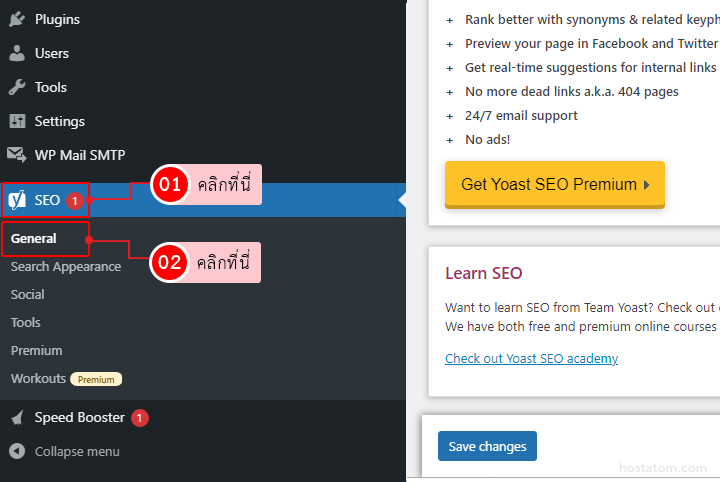 1.Login เข้า WordPress ที่หน้า Dashboard คลิกที่ SEO => General