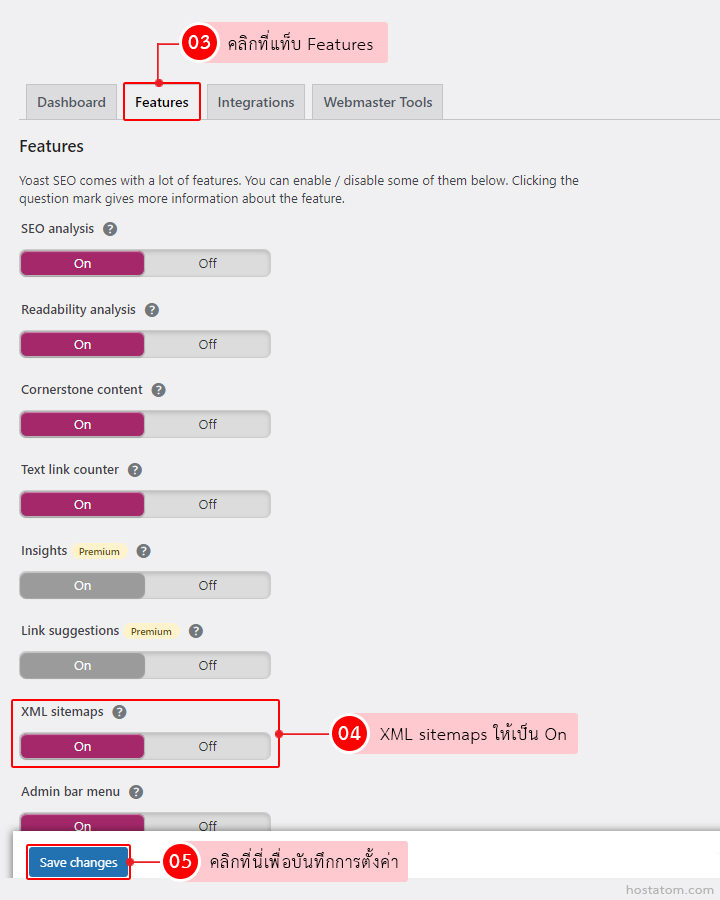 2. เลือกแท็บ Features ที่ XML sitemaps ให้ปรับเป็น On จากนั้นคลิกที่ Save changes เพื่อบันทึกการตั้งค่า