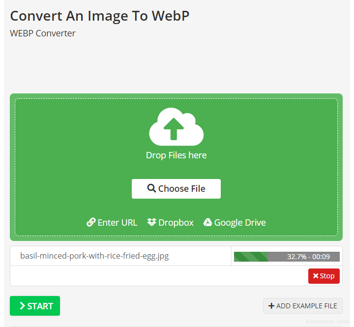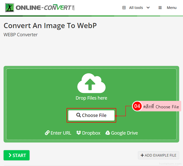 คุณสามารถเลือกไฟล์รูปภาพที่จะนำมาแปลงเป็นไฟล์ webp ได้จาก URL ของภาพ หรือจาก Dropbox หรือจาก Google Drive ก็ได้ ในตัวอย่างนี้ ทางเราขอเลือกวิธีการอัปโหลดไฟล์ภาพขึ้นไป โดยให้คลิกที่ิ Choose File