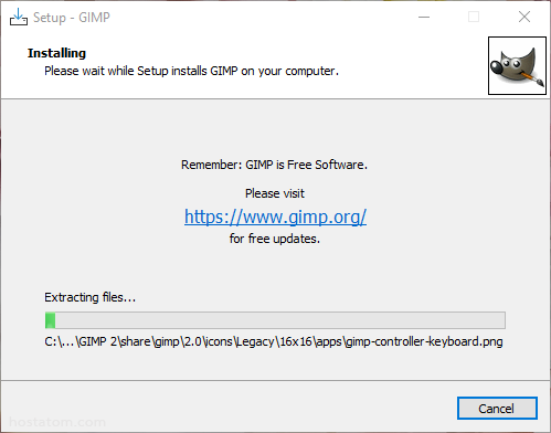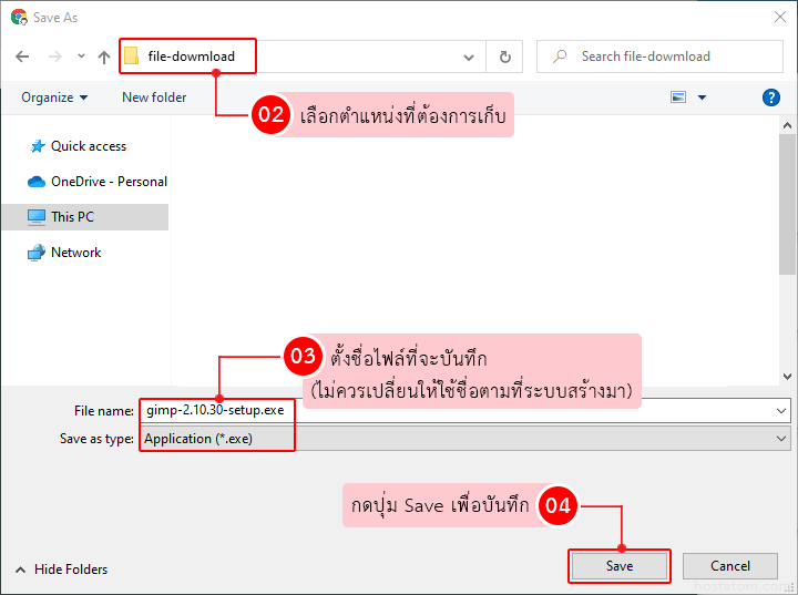 โปรแกรมจะแสดงหน้าต่างเพื่อให้ระบุตำแหน่งที่ต้องการจัดเก็บโปรแกรม GIMP และชื่อโปรแกรมที่ต้องการบันทึก (แนะนำว่าไม่ควรเปลี่ยน ควรใช้ชื่อตามที่ระบบสร้างมา) => คลิกปุ่ม Save เพื่อบันทึก