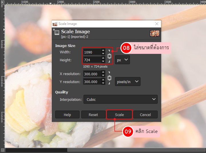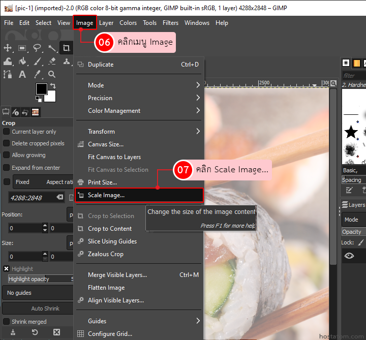 เมื่อภาพที่ต้องการแสดงเรียบร้อยแล้วทำการเปลี่ยนขนาดภาพ โดยไปที่เมนูด้านบนเลือก Image => Scale Image…
