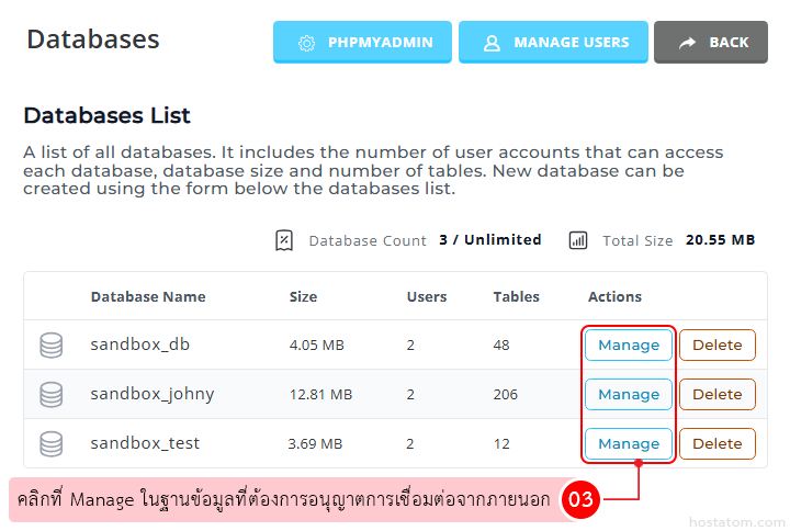 คลิกที่ Manage ในฐานข้อมูลที่ต้องการอนุญาตการเชื่อมต่อจากภายนอก
