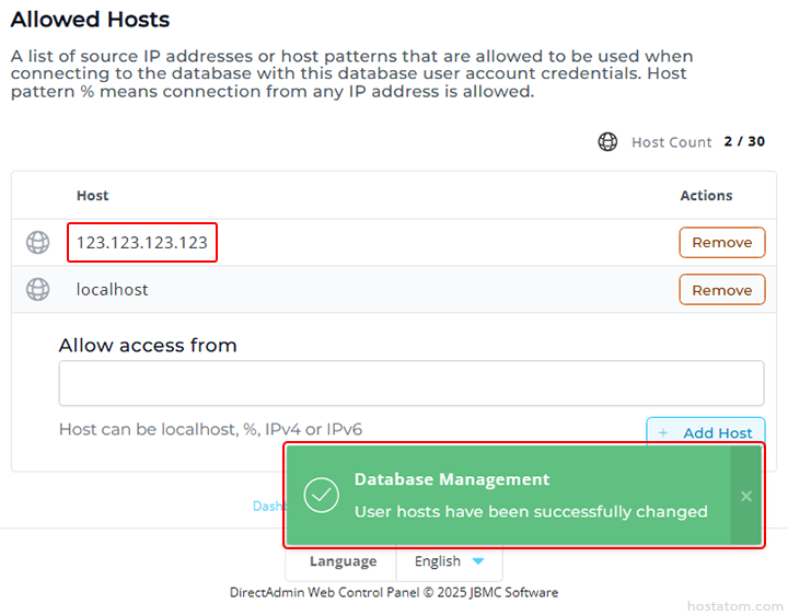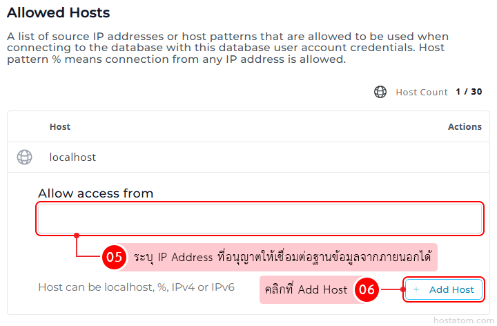 ระบุ IP Address ที่อนุญาตให้เชื่อมต่อฐานข้อมูลจากภายนอกได้ที่หัวข้อ Allow access from ในหมวด Allowed Hosts จากนั้นคลิกที่ Add Host