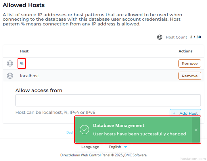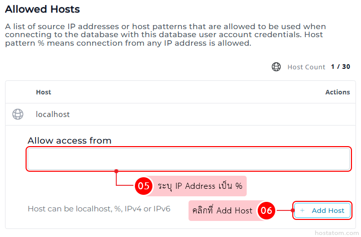 ระบุ IP Address เป็น % ที่หัวข้อ Allow access from ในหมวด Allowed Hosts จากนั้นคลิกที่ Add Host