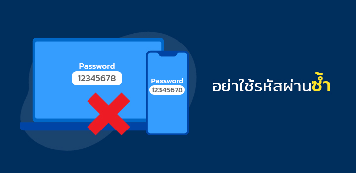 อย่า…อย่าใช้รหัสผ่านอันเดียวกับทุกเว็บ ทุกบริการ และทุกแอพพลิเคชันที่ใช้งาน เพราะหากแฮกเกอร์ได้รหัสผ่านไป หมดเลยนะ ข้อมูลทุกอย่างที่มีอยู่ ดังนั้น ควรตั้งรหัสผ่านแต่ละบริการ อย่าให้ซ้ำกัน หากกลัวลืมก็ตั้งให้เป็นเอกลักษณ์แบบที่เราจำเองได้ดีกว่า เช่น รหัสผ่าน Facebook อาจจะตั้งเป็น Fgl@12Yt=54$B โดยใช้ FB ซึ่งตัว F อยู่ข้างหน้า B อยู่ข้างหลัง ถ้าเป็นอีเมล Gmail ก็ตั้งเป็น Ggl@12Yt=54$M คราวนี้รหัสผ่านก็ไม่ซ้ำกันแล้ว และยังช่วยจำได้ง่ายด้วย