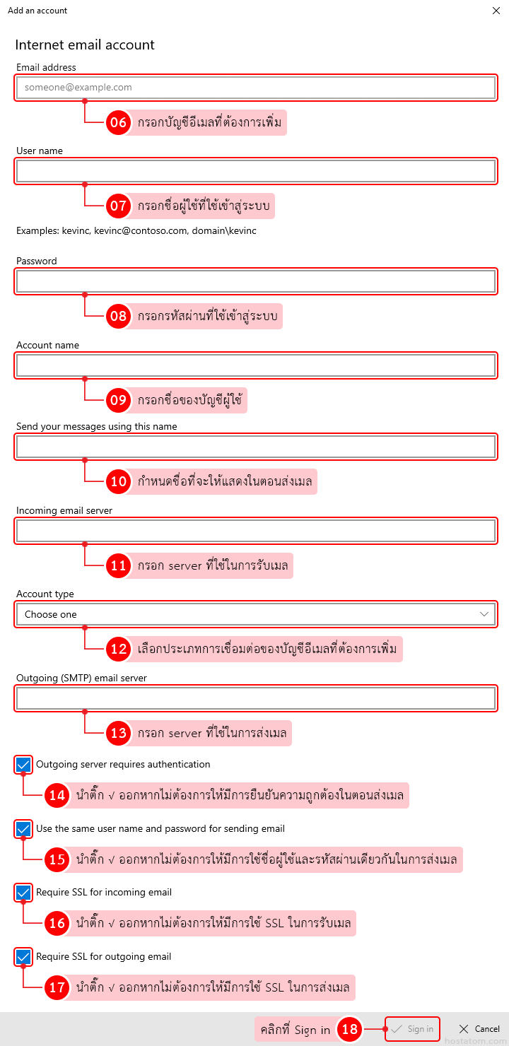 กรอกรายละเอียดของบัญชีอีเมลที่ต้องการเพิ่ม เมื่อเสร็จแล้วให้คลิกที่ Sign in