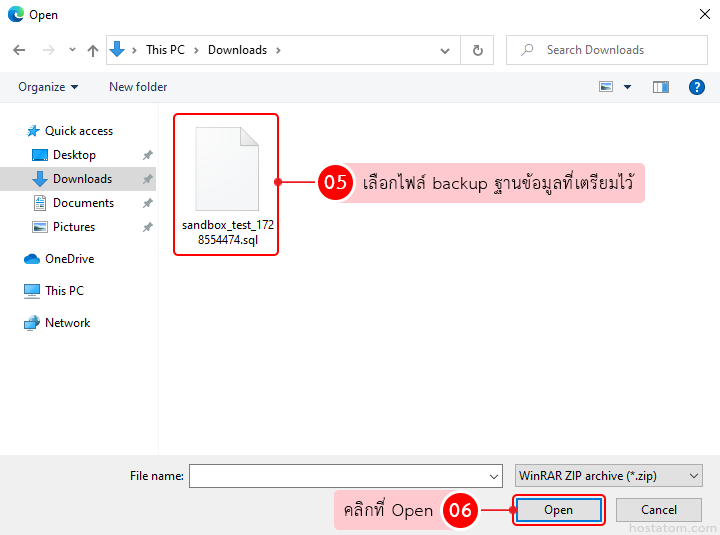 เลือกไฟล์ backup ฐานข้อมูลที่เตรียมไว้ จากนั้นคลิกที่ Open