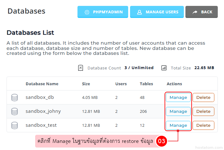 คลิกที่ Manage ในฐานข้อมูลที่ต้องการ restore ข้อมูล