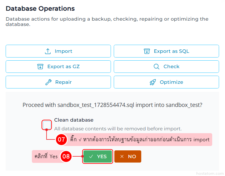 ติ๊กถูกที่ Clean database หากต้องการให้ลบฐานข้อมูลเก่าออกก่อนดำเนินการ import จากนั้นคลิกที่ Yes