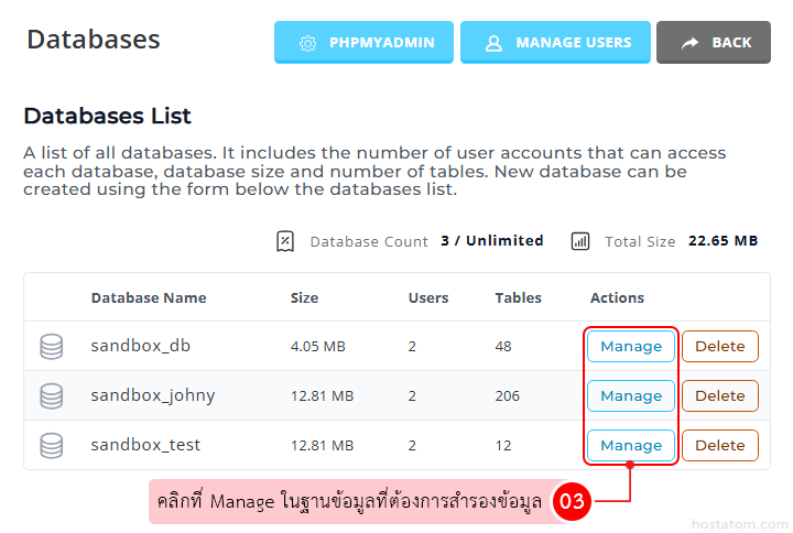 คลิกที่ Manage ในฐานข้อมูลที่ต้องการสำรองข้อมูล