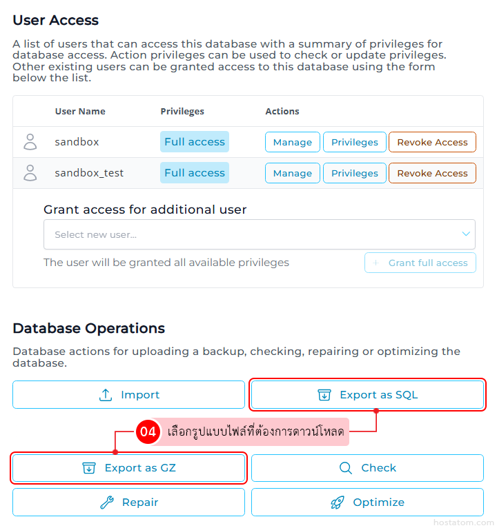 - Download as GZ – ดาวน์โหลดไฟล์ฐานข้อมูลในรูปแบบของไฟล์ .zip (ไฟล์ที่ได้จะมีขนาดเล็กลงและดาวน์โหลดได้เร็ว)