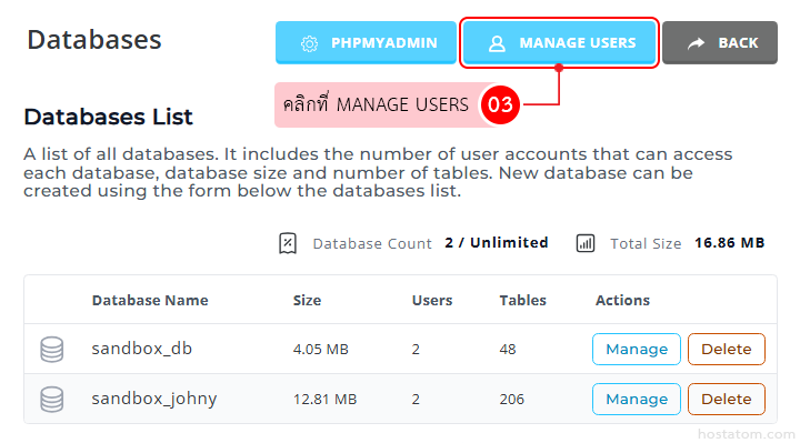 ระบบจะแจ้งว่าได้เพิ่มผู้ใช้ฐานข้อมูลดังกล่าว และแสดงรายละเอียดของของผู้ใช้ฐานข้อมูลดังภาพตัวอย่าง