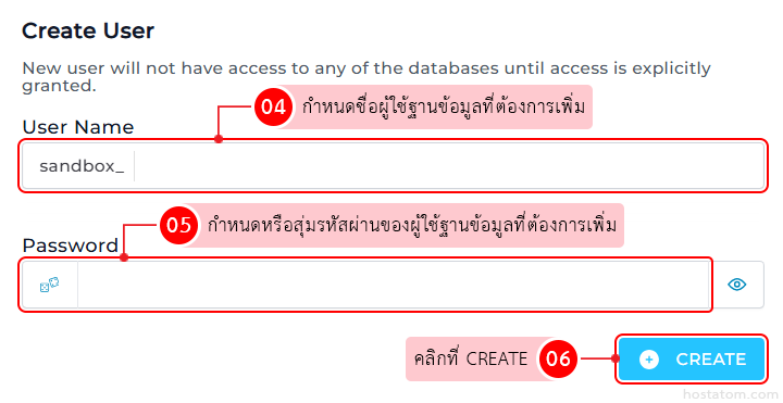 กำหนดรายละเอียดของผู้ใช้ฐานข้อมูลที่ต้องการเพิ่มในหัวข้อ Create User เมื่อเสร็จแล้วให้คลิกที่ CREATE