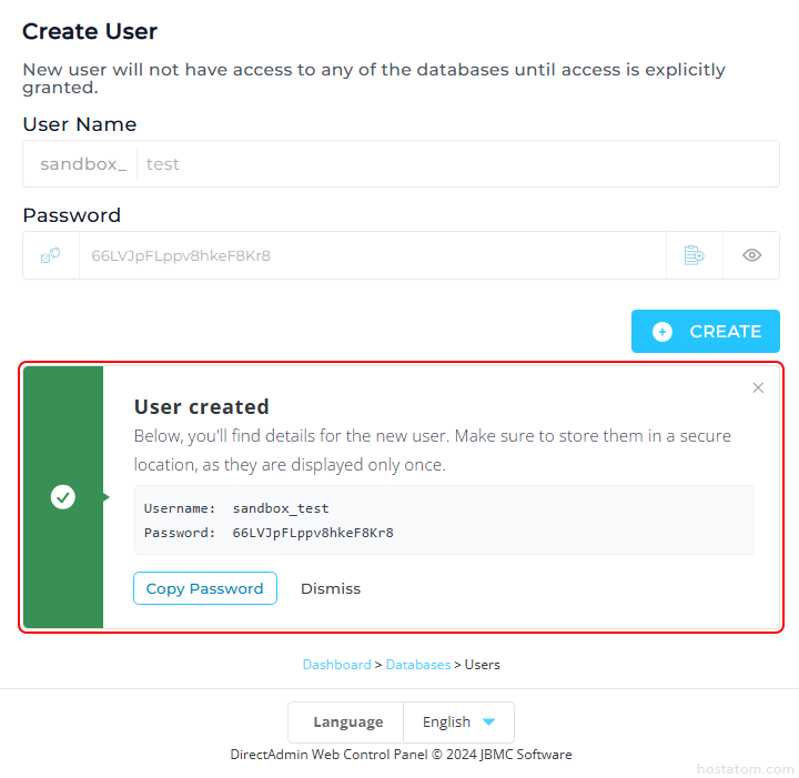 - Password – กำหนดหรือสุ่มรหัสผ่านของผู้ใช้ฐานข้อมูลที่ต้องการเพิ่ม