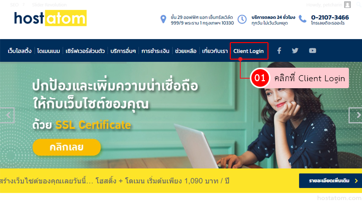 เปิดเว็บไซต์ของโฮสอะตอม โดยพิมพ์ URL: hostatom.com จากนั้น คลิกที่เมนู Client Login