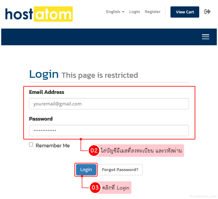 • Email Address: ใส่อีเมลที่ได้ลงทะเบียนไว้กับทางโฮสอะตอม
