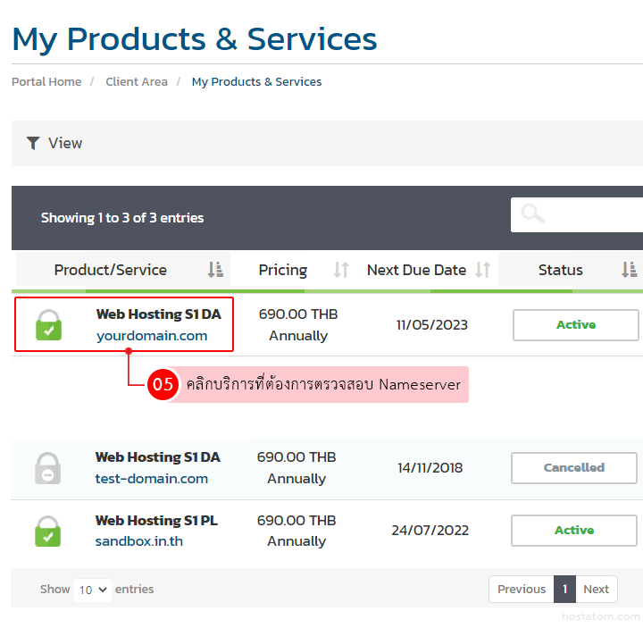 คลิกบริการที่ต้องการตรวจสอบค่า Nameserver จากตัวอย่างจะขอตรวจสอบค่า Nameserver ของบริการ Web Hosting ของโดเมน yourdomain.com