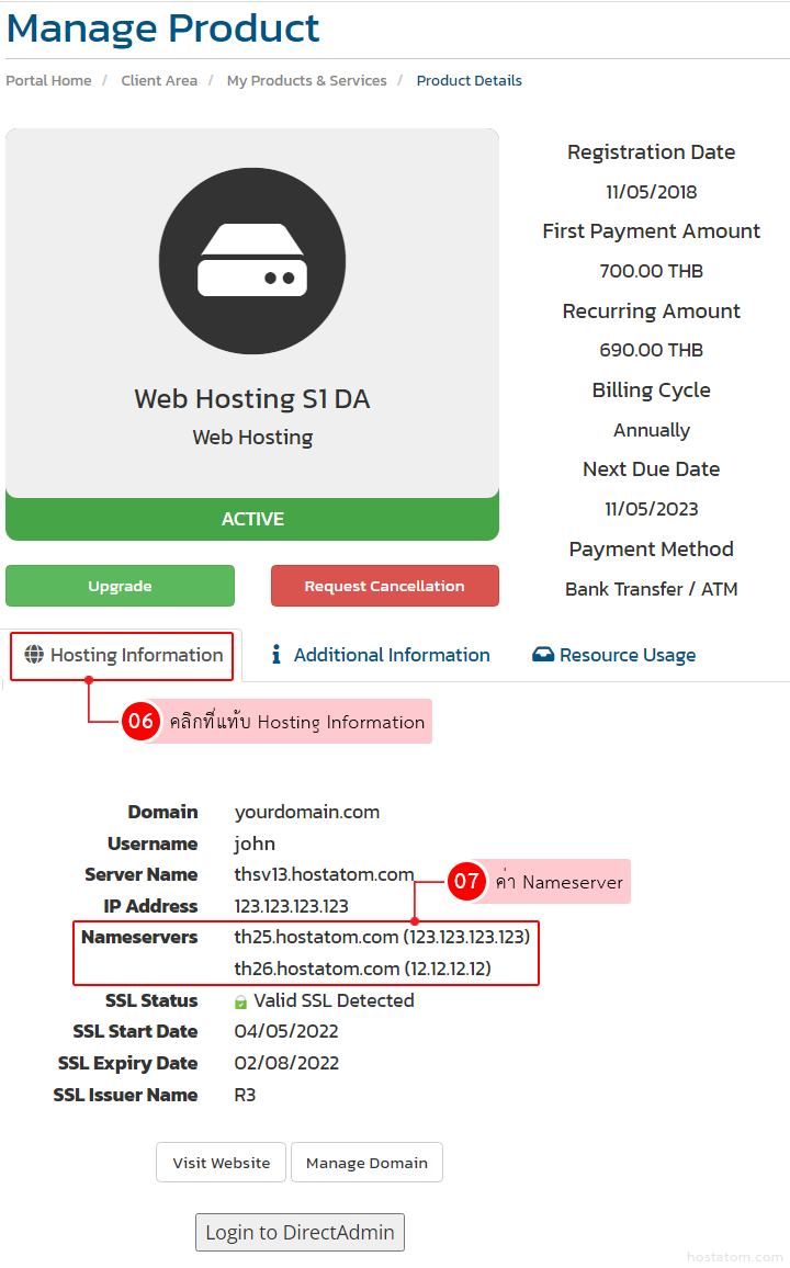 ในหน้า Manage Product เลื่อนลงมาด้านล่าง คลิกที่แท้บ Hosting Information