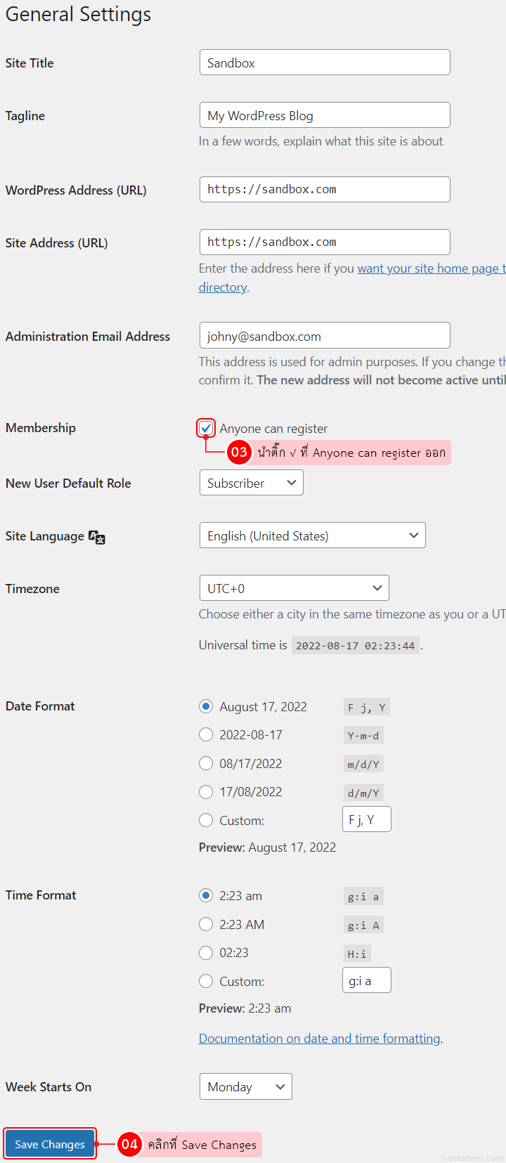 นำติ๊กถูกที่ Anyone can register ในหัวข้อ Membership ออก จากนั้นคลิกที่ Save Changes