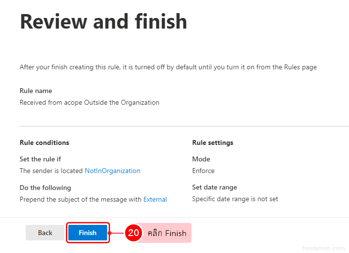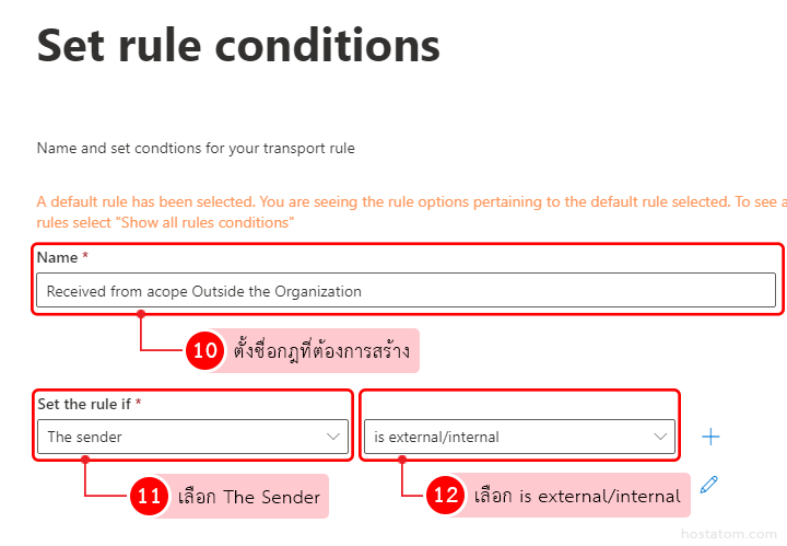 - Name: ให้ใส่ชื่อของกฎ โดยให้ตั้งขึ้นมาเอง จากตัวอย่างเราจะตั้งกฎให้แสดง Tag ข้อความ External เมื่อมีอีเมลจากภายนอกองค์กรส่งเข้ามา ดังนั้นขอใส่ว่า Received from scope Outside the Organization
