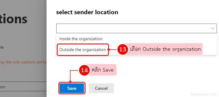 ซึ่งเราจะทำการสร้าง Tag เพื่อบอกว่าอีเมลฉบับนั้นถูกส่งมาจากผู้ที่อยู่นอกองค์กร ดังนั้นให้เลือก Outside the organization จากนั้นกดปุ่ม Save เพื่อบันทึกการตั้งค่า