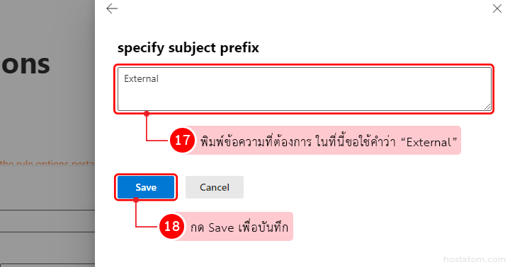 เมื่อเลือกข้อที่ 2 เรียบร้อยแล้ว ระบบจะแสดงหน้าต่างขึ้นมาด้านข้างให้ใส่ข้อความที่เราต้องการในช่อง specify subject prefix ซึ่งจากตัวอย่างนี้ขอเลือกใช้คำว่า “External”