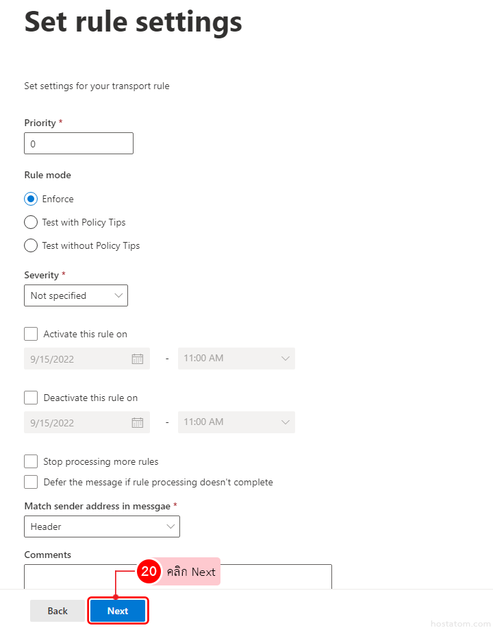 ในหน้าถัดของการ Settings for your transport rule ในหน้านี้ไม่ต้องดำเนินการตั้งค่าใดๆ ให้ใช้ค่า default ที่ระบบตั้งมาได้เลย ให้กดปุ่ม Next