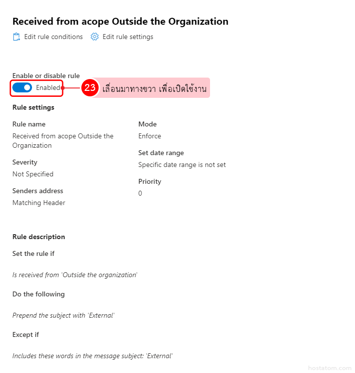 ระบบจะแสดงหน้าต่างขึ้นมาด้านข้าง ที่ Enable or disable rule ให้เลื่อนมาทางขวา เพื่อเปิดใช้งานกฎที่สร้างขึ้น