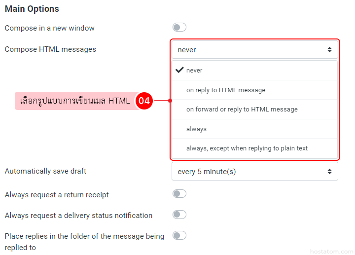 - always, except when replying to plain text : ใช้การเขียนเมล HTML ยกว้นการตอบกลับเมลธรรมดา