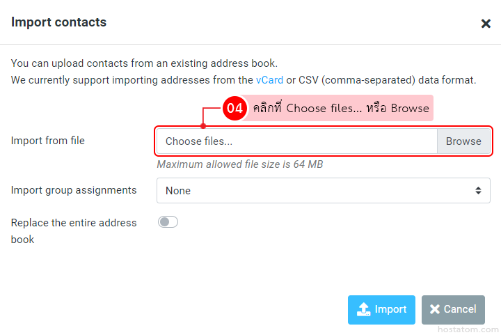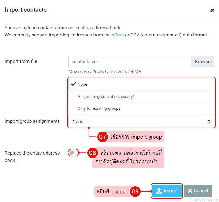 • Replace the entire address book – หากต้องการให้แทนที่รายชื่อผู้ติดต่อที่มีอยู่ก่อนหน้าให้คลิกเปิด (เมื่อเปิดแล้วปุ่มหลัง Replace the entire address book จะเป็นสีฟ้า)