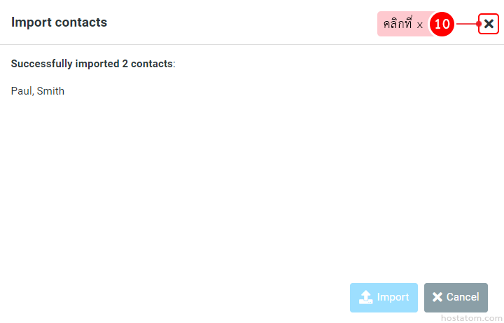 ระบบจะแจ้งว่าได้ import รายชื่อผู้ติดต่อมาที่บัญชีอีเมลแล้ว จากนั้นให้คลิกที่ x