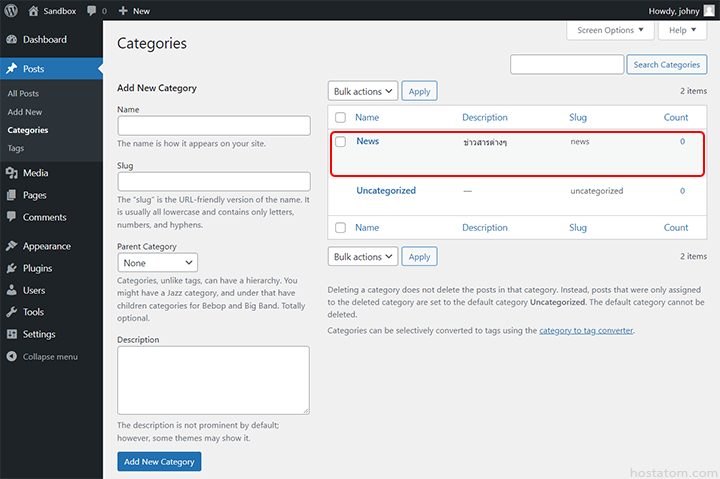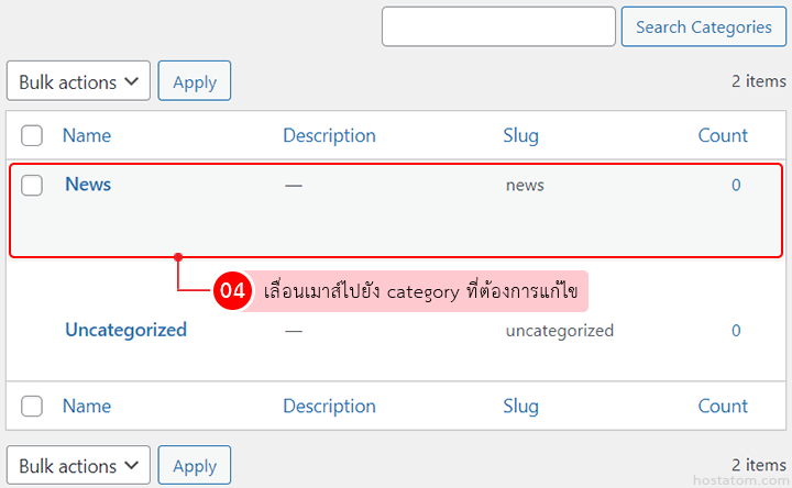 เมื่อกลับมาที่หน้า Categories จะเห็นว่าข้อมูล category ที่ได้แก้ไขไปมีการเปลี่ยนแปลง (จากรูปตัวอย่างจะมีข้อมูลในส่วน description เพิ่มเข้ามา)